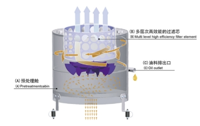 · 机油旋转涡轮产生的离心力,聚结原理加速作用使油雾轻易结合在一起并转换为液体状态。